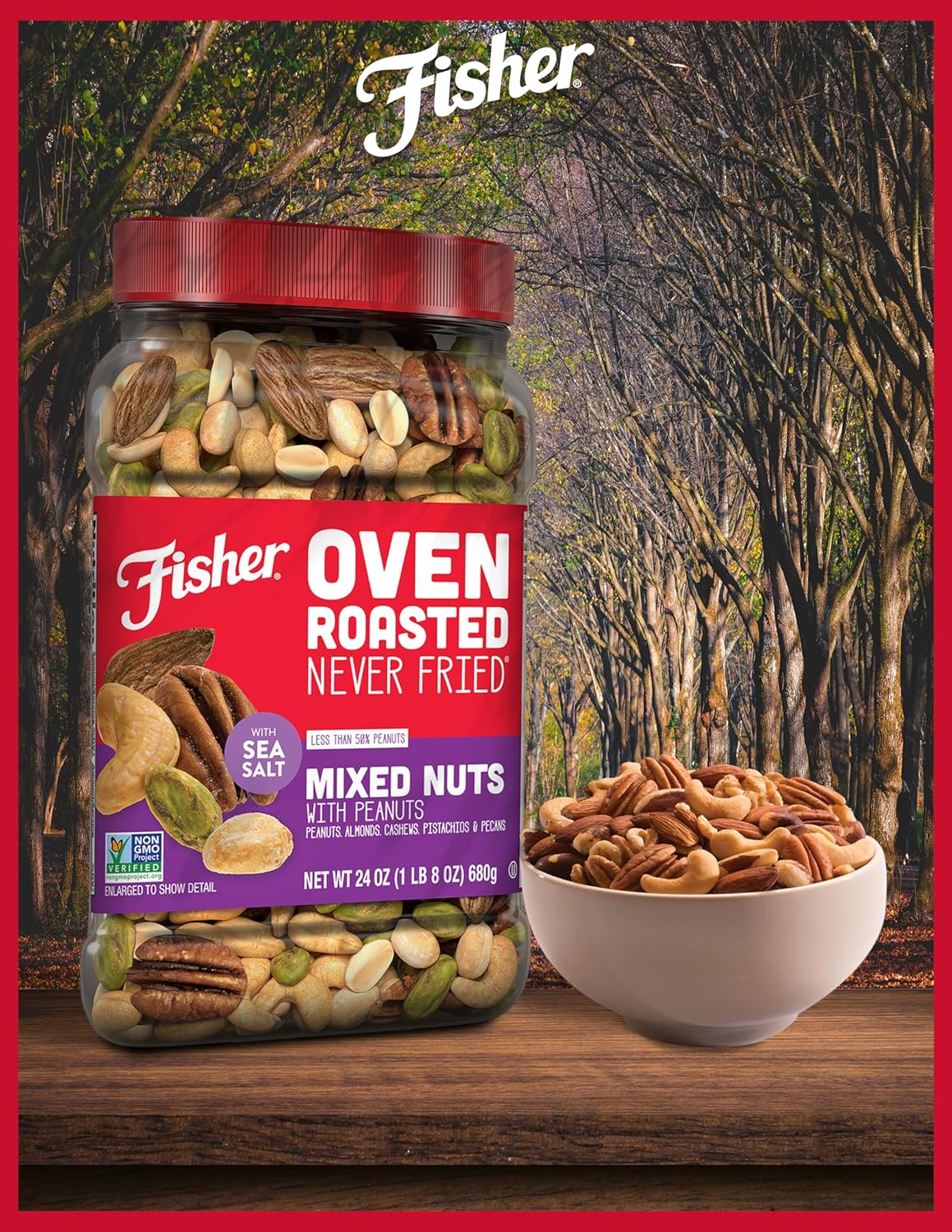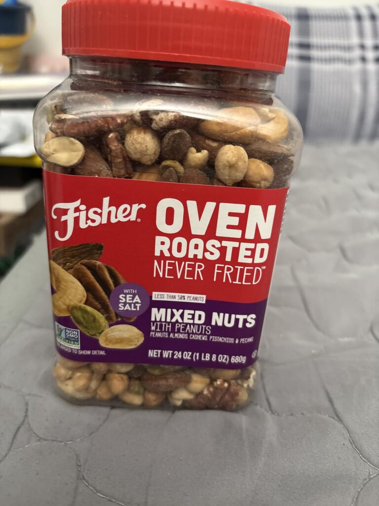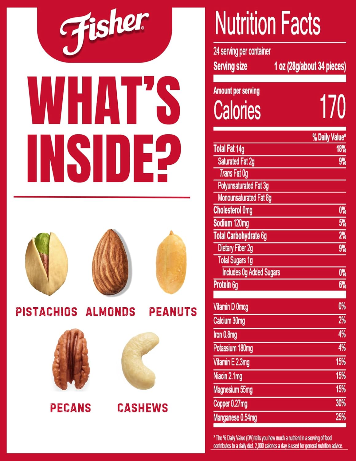 Fisher Oven Roasted Never Fried Mixed Nuts with Peanuts, 24 Ounces (Pack of 1), Peanuts, Almonds, Cashews, Pistachios, Pecans, Trail Mix, Healthy Snacks for Adults, Made With Sea Salt, No Added Oils