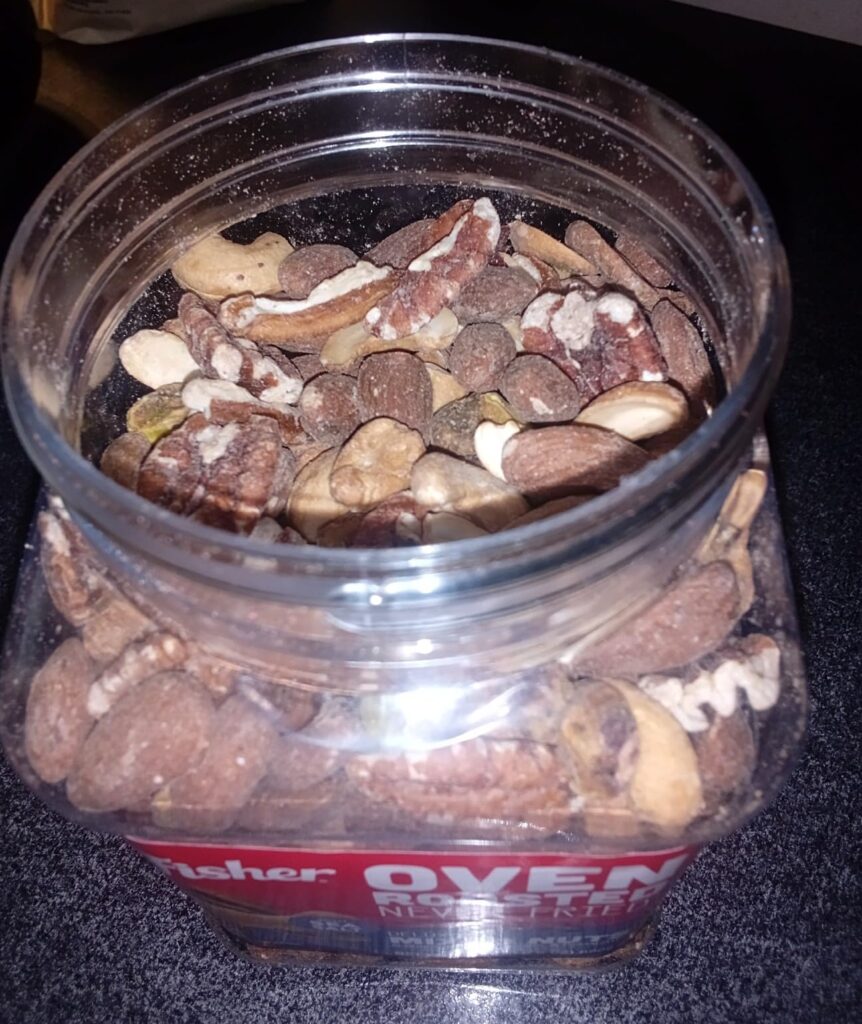 Live roasted nuts and it’s good that the container is filled up and not half filled. It is not greasy as it is roasted.