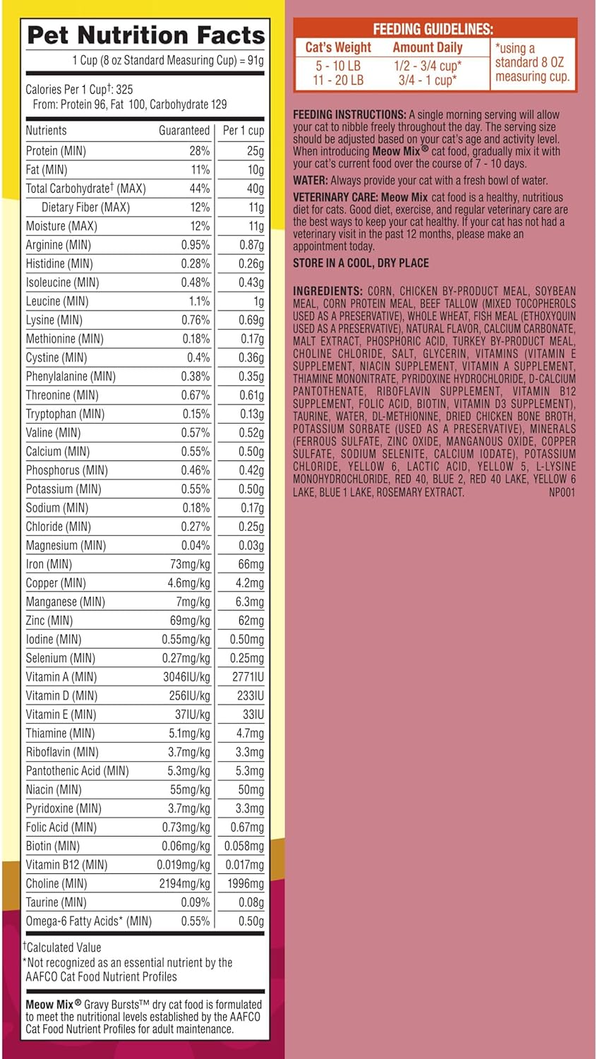 Cat’s Weight 5 – 10 lbs. = Amount Daily 1/2 – 3/4 cup (using a standard 8 oz. measuring cup) Cat’s Weight 11 – 16 lbs. = Amount Daily 3/4 – 1 cup (using a standard 8 oz. measuring cup) A single morning serving will allow your cat to nibble freely throughout the day. The serving size should be adjusted based on your cat’s age and activity level. Kittens – Feed 2 times the adult requirement. Pregnant or Nursing Cats – Feed 2-4 times the adult requirement. Always provide your cat with a fresh bowl of water. Changes in your cat’s diet should be made gradually to allow your cat to become accustomed to a new food. Substitute small amounts of the new food for the old food, gradually increasing the amount of the new food while decreasing the old food over a period of 7 – 10 days. When introducing Meow Mix® Gravy Bursts cat food, gradually mix it with your cat’s current food over the course of 7-10 days. *Based on a standard 8-oz measuring cup. Kittens (Under 1 Year) Feed 2 times the adult requirement. Pregnant and Nursing Cats Feed 2-4 times the adult requirement.